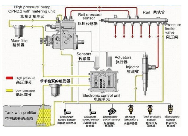 一、高压共轨技术让燃烧更充分,提高燃油利用率。高压共轨是将喷油泵和共轨系统连接,保证共轨管道及其连接的喷油嘴保持稳定高压(约1600帕),燃油电控系统单独控制喷油嘴开启和关闭,确保在正确时间点四个喷油嘴提供完全相同的油压,以及精确的喷油量,极大提高发动机的工作效率。