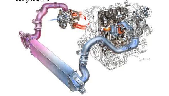 而中间冷却(中冷)技术则是通过冷却空气温度达到增大进气密度的目的,增压空气温度每下降10摄氏度,柴油机功率提高3%-5%,还能降低排放中的氮氧化合物(NOX)。