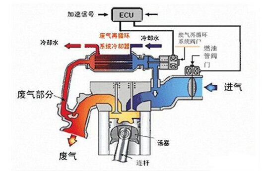 三、EGR系统减少废气氮氧化合物含量。废气再循环系统即EGR,是将柴油机产生的废气的极少部分再送回气缸。再循环废气由于具有惰性将会延缓燃烧过程,因为氮气和氧气只有在高温高压下才能产生,也就是说燃烧速度将会放慢从而导致燃烧室中的压力形成过程放慢,降低了氮氧化合物的产生。