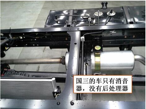 四、找DOC+POC后处理系统。这是容易辨识的标志,只需要蹲下来从车底看排气管上是否有两个柱形罐状装置。国III车只有一个,即消音器;而国IV车则有两个,其一为消音器,另一为DOC+POC后处理系统。