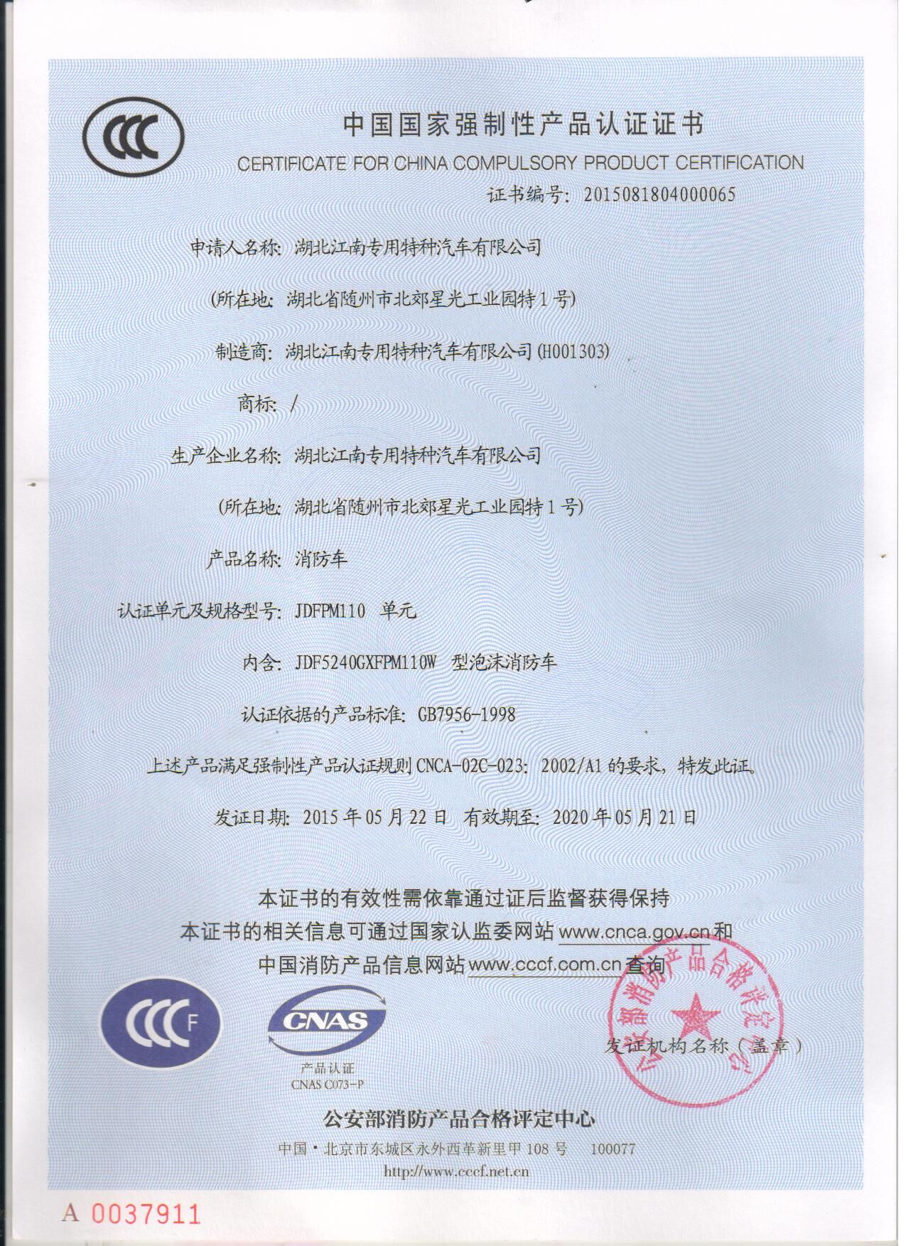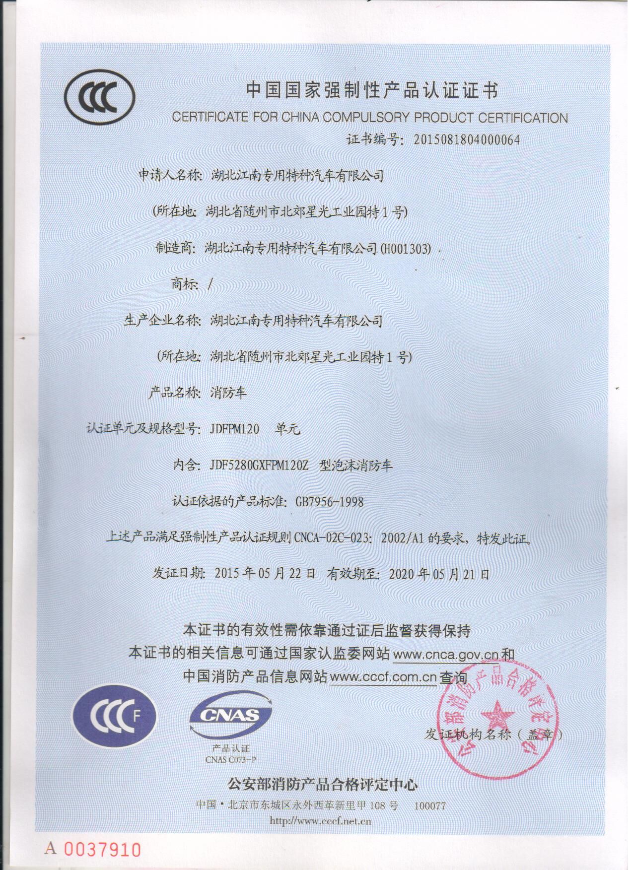 日前,我公司的消防车产品通过了公安部3C认证,首批出来的证书是重汽豪沃12吨后双桥泡沫消防车以及重庆五十铃11吨泡沫消防车,其它车型后将陆续下发,以下是这两款车的3C证书:
