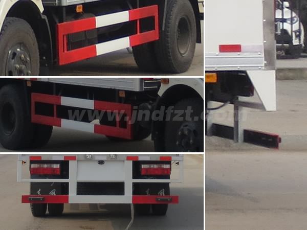 其它 | 随底盘选装驾驶室;厢体顶部封闭,不可开启;运输具有独立容器(瓶)包装的:含废机油,废矿物油,含铜废物,含镍废物,含铅废物,含铬废物,废弃电池,有色金属冶炼废物,其他废物(含油抹布)(含铅酸电池)以及《国家危险废物名录》中危险废物,类项号:9,危险废物编号:HW08,HW21,HW22,HW23, HW26,HW31,HW46,HW48,HW49;厢体选装瓦楞板结构,厢体侧面选装开门型式及位置或不带侧开门,选装百叶窗,选装液压升降尾板(收起状态水平长度为290mm);仅采用前轮盘式制动器,前置排气管,子午线轮胎,限速装置的底盘,限速80km/h;该车安装具有卫星定位功能的行驶记录仪;ABS系统生产厂家,型号:襄阳东风隆诚机械有限责任公司,ABS/ASR-24V-4S/4M;侧面防护及后下部防护装置材料材质:Q235,连接方式:焊接加螺栓连接;后下部防护装置断面尺寸(宽×高):40×100(mm),离地高度:420mm. | ||