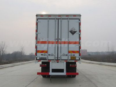 其它 | 厢体顶部封闭,不可开启;随底盘选装驾驶室及铝合金油箱;仅选用后轴为空气悬架配置的底盘;厢体侧面选装不带侧开门;额定载质量/整备质量(kg)对应关系为:10700/7105,9995/7810;该车用于运输具有独立容器(瓶)包装的:氨溶液(水溶液存15°时的相对密度为0.880至0.975,含氨量高于10%,但不超过35%)、硫酸、酸性电池液、碱性电池液、硫酸废液、碱石灰、一氯化碘、硝酸、甲醛溶液(甲醛含量不低于25%)、乙酸酐、固态氟化铬、氟化铬溶液、固态氢氧化钠、氢氧化钠溶液,类项号:8;该车为危险品货物运输车;仅采用前轮盘式制动器,前置排气管,子午线轮胎,限速装置的底盘,限速80km/h;发动机B6.2NS6B230,D4.5NS6B220,YCS04200-68,CY4SK761油耗申报值均为26.6L/100km;该车安装具有卫星定位功能的行驶记录仪;ABS系统生产厂家,型号 :焦作博瑞克控制技术有限公司,J ABS;侧面防护及后下部防护装置材料材质:Q235,连接方式:焊接加螺栓连接;后下部防护装置断面尺寸(宽×高):50×120(mm),离地高度:495mm. 该车后轴为采用空气悬架. | ||