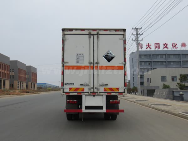 其它 | 随底盘选装驾驶室;厢体顶部封闭,不可开启;运输具有独立容器(瓶)包装的:氨溶液(氨水)或甲醛溶液或除锈磷化液(除锈磷化处理剂)或电池电池液或木馏油,类项号:8;该车为危险品货物运输车;厢体选装瓦楞板结构,厢体侧面选装开门型式及位置或不带侧开门,选装百叶窗,选装后部双拉杆结构,选装液压尾板(收起状态水平长度为290mm);仅采用前轮盘式制动器,前置排气管,子午线轮胎,限速装置的底盘,限速80km/h;后轴仅采用空气悬架;该车安装具有卫星定位功能的行驶记录仪;ABS系统生产厂家,型号 :焦作博瑞克控制技术有限公司,J ABS;侧面防护及后下部防护装置材料材质:Q235,连接方式:焊接加螺栓连接;后下部防护装置断面尺寸(宽×高):50×120(mm),离地高度:495mm. 该车后轴为采用空气悬架. | ||