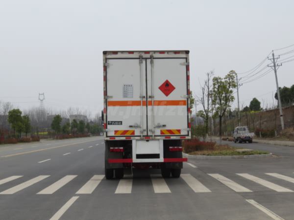 其它 | 厢体顶部封闭,不可开启;运输具有独立容器(瓶)包装的易燃气体:液化石油气,原油气,压缩天然气,乙炔,甲烷,乙烷,丙烷,丁烷,丙烯,丁烯,二甲醚,打火机或打火机加油器(装有易燃气体),压缩氢,类项号:2.1;运输具有独立容器(瓶)包装的非易燃无毒气体:液化气体(非易燃,充有氮,二氧化碳或空气),压缩氧(氮,空气,氦,氩,氖),二氧化碳,类项号2.2;该车为危险品货物运输车;厢体选装瓦楞板结构,厢体侧面选装开门型式及位置或不带侧开门,选装百叶窗,选装后部双拉杆结构,选装液压尾板(收起状态水平长度为290mm);仅采用前轮盘式制动器,前置排气管,子午线轮胎,限速装置的底盘,限速80km/h;后轴仅采用空气悬架;该车安装具有卫星定位功能的行驶记录仪;ABS系统生产厂家,型号 :焦作博瑞克控制技术有限公司,J ABS;侧面防护及后下部防护装置材料材质:Q235,连接方式:焊接加螺栓连接;后下部防护装置断面尺寸(宽×高):50×120(mm),离地高度:495mm. 该车后轴为采用空气悬架. | ||