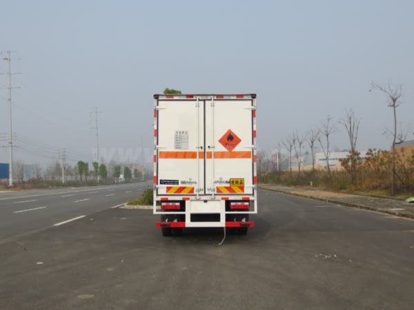 其它 | 随底盘选装驾驶室;厢体顶部封闭,不可开启;运输具有独立容器(瓶)包装的:粘合剂,涂料,涂料溶液,煤油,苯,甲醇,乙醇,丙酮,甲苯,二甲苯,机油,类项号:3;厢体选装瓦楞板结构,厢体侧面选装开门型式及位置或不带侧开门,选装百叶窗,选装液压升降尾板(收起状态水平长度为290mm);仅采用前轮盘式制动器,前置排气管,子午线轮胎,限速装置的底盘,限速80km/h;该车安装具有卫星定位功能的行驶记录仪;ABS系统生产厂家,型号 :襄阳东风隆诚机械有限责任公司,ABS/ASR-24V-4S/4M;侧面防护及后下部防护装置材料材质:Q235,连接方式:焊接加螺栓连接;后下部防护装置断面尺寸(宽×高):50×120(mm),离地高度:420mm. 该车后轴为采用空气悬架. | ||