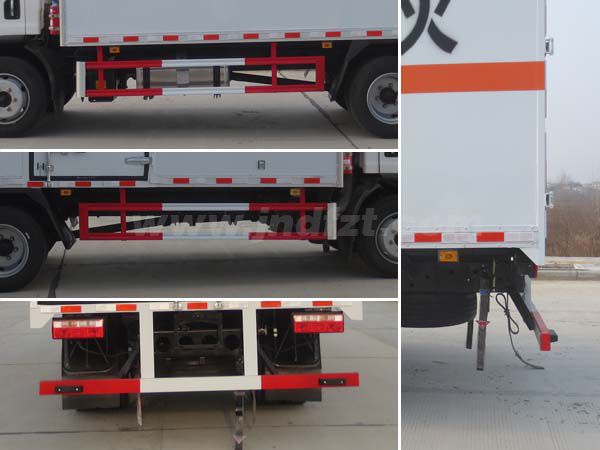其它 | 厢体顶部封闭,不可开启;随底盘选装驾驶室;仅采用底盘3900mm轴距;厢体侧面选装不带侧开门;该车用于运输具有独立容器(瓶)包装的易燃气体:液化石油气,原油气,压缩天然气,乙炔,甲烷,乙烷,丙烷,丁烷,丙烯,丁烯,二甲醚,打火机或打火机加油器(装有易燃气体),压缩氢,类项号:2.1;运输具有独立容器(瓶)包装的非易燃无毒气体:液化气体(非易燃,充有氮,二氧化碳或空气),压缩氧(氮,空气,氦,氩,氖),二氧化碳,类项号2.2;该车为危险品货物运输车;仅采用前轮盘式制动器,前置排气管,子午线轮胎,限速装置的底盘,限速80km/h;转向轮安装爆胎应急防护装置;发动机/油耗申报值(L/100km)对应关系为:WP3NQ160E61/20.8;该车安装具有卫星定位功能的行驶记录仪;ABS生产厂家/型号:1.广州瑞立科密汽车电子股份有限公司/CM4XL-4S/4M;2.浙江万安科技股份有限公司/VIE ABS-II;侧面防护及后下部防护装置材料材质:Q235,连接方式:焊接加螺栓连接;后下部防护装置断面尺寸(宽×高):50×100(mm),离地高度:480mm. | ||