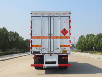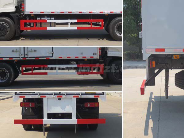 其它 | 厢体顶部封闭,不可开启;随底盘选装驾驶室;厢体选装瓦楞板结构,厢体侧面选装开门型式及位置或不带侧开门,选装百叶窗;运输具有独立容器(瓶)包装的:粘合剂,涂料,涂料溶液,煤油,苯,甲醇,乙醇,丙酮,甲苯,二甲苯,机油,类项号:3;该车为危险品货物运输车;仅采用前轮盘式制动器,前置排气管,子午线轮胎,限速装置的底盘,限速80km/h;转向轮安装爆胎应急防护装置;后轴采用空气悬架;发动机/油耗申报值(L/100km)对应关系为:ISD210 50/25.6,ISB210 50/25.9,ISB190 50/25.9;该车安装具有卫星定位功能的行驶记录仪;ABS型号:3631010-C2000,4460046440;生产厂家:东科克诺尔商用车制动系统(十堰)有限公司,威伯科汽车控制系统(中国)有限公司;侧面防护及后下部防护装置材料材质:Q235,连接方式:焊接加螺栓连接;后下部防护装置断面尺寸(宽×高):50×120(mm),离地高度:495mm. | ||
