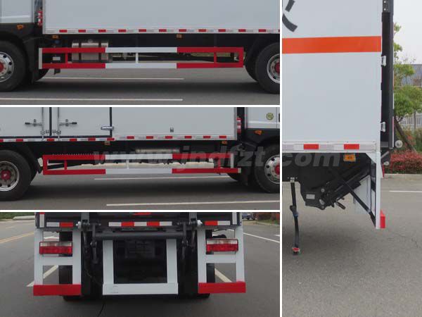 其它 | 厢体顶部封闭,不可开启;随底盘选装驾驶室;起重尾板为选装件(收起状态水平长度为290mm),尾板质量为545kg;厢体侧面选装开门型式和位置,选装不带侧开门;额定载质量/整备质量(kg)对应关系为:10700/7105,9995/7810;该车用于运输具有独立容器(瓶)包装的易燃气体:液化石油气,原油气,压缩天然气,乙炔,甲烷,乙烷,丙烷,丁烷,丙烯,丁烯,二甲醚,打火机或打火机加油器(装有易燃气体),压缩氢,类项号:2.1;运输具有独立容器(瓶)包装的非易燃无毒气体:液化气体(非易燃,充有氮,二氧化碳或空气),压缩氧(氮,空气,氦,氩,氖),二氧化碳,类项号2.2;仅采用前轮盘式制动器,前置排气管,子午线轮胎,限速装置的底盘,限速80km/h;后轴为空气悬架;转向轮安装爆胎应急防护装置;发动机B6.2NS6B230,D4.5NS6B220,YCS04200-68,CY4SK761油耗申报值均为26.6L/100km;该车安装具有卫星定位功能的行驶记录仪;ABS系统生产厂家,型号 :焦作博瑞克控制技术有限公司,J ABS;侧面防护及后下部防护装置材料材质:Q235,连接方式:焊接加螺栓连接;后下部防护装置断面尺寸(宽×高):50×120(mm),离地高度:485mm. | ||