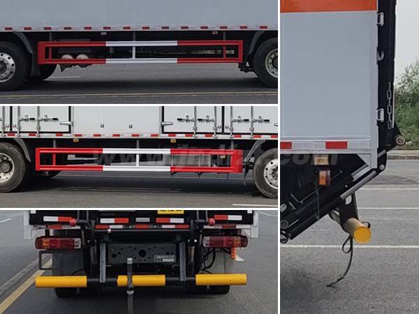其它 | 车厢顶部封闭不可开启;EBS系统控制器生产企业/型号为威伯科(上海)管理有限公司/EBS3;安装有限速装置,限速装置限速(km/h):80;安装有具有卫星定位功能的行驶记录仪;随底盘选装驾驶室;选装厢体开门型式及位置;选装瓦楞板结构厢体;选装后部结构;起重尾板为选装件(收起状态水平长度为290mm),尾板质量为550kg;选装不同厂家尾板以及尾板外观;该车选装ETC车载装置;发动机/油耗申报值(L/100km)对应关系为:MC07.25-60/29.42,MC07.31-60/29.42;侧面防护及后下部防护装置材料材质:Q235,侧面防护连接方式:焊接连接;后下部防护装置连接方式:焊接加螺栓连接,断面尺寸(直径):Φ120(mm),离地高度:460mm;不带起重尾板时,后防护连接方式:焊接连接;后下部防护装置断面尺寸(宽×高):60×120(mm),离地高度:450mm;运输独立容器(瓶)包装的介质类项号为:3;该车为危险品货物运输车;仅采用前轮盘式制动器,前置排气管,子午线轮胎;转向轮安装爆胎应急防护装置;后轴采用空气悬架。 | ||
