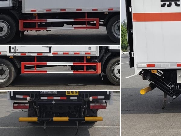 其它 | 车厢顶部封闭不可开启;ABS型号/厂家:ABS型号:ABS/ASR-24V-4S/4M,厂家:襄阳东风隆诚机械有限责任公司;安装有限速装置;限速装置限速(km/h):80;安装有具有卫星定位功能的行驶记录仪;随底盘选装驾驶室;选装厢体开门型式及位置;选装瓦楞板结构厢体;起重尾板为选装件(收起状态水平长度为290mm),尾板质量为450kg;选装不同厂家尾板以及尾板外观;仅采用底盘3390mm轴距;该车选装ETC车载装置;发动机/油耗申报值(L/100km)对应关系为:D25TCIF1/20.3;侧面防护及后下部防护装置材料材质:Q235,侧面防护连接方式:焊接连接;后下部防护装置连接方式:焊接加螺栓连接,断面尺寸(直径):Φ110(mm),离地高度:475mm;不带起重尾板时,后防护连接方式:焊接加螺栓连接;后下部防护装置断面尺寸(宽×高):45×100(mm),离地高度:460mm;运输独立容器(瓶)包装的货物,危险货物类项号:9;该车为危险品货物运输车;仅采用前轮盘式制动器,前置排气管,子午线轮胎;转向轮安装爆胎应急防护装置; | ||