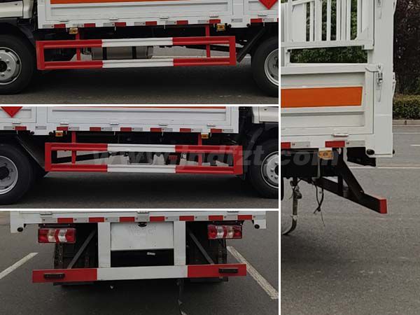其它 | ABS系统控制器型号/生产厂家:VIE ABS-Ⅱ/浙江万安科技股份有限公司;安装有限速装置;限速装置限速(km/h):80;安装有具有卫星定位功能的行驶记录仪;选装厢体外观,选装后部结构;选装起重尾板(收起状态水平长度为290mm),尾板质量为450kg;选装不同厂家尾板以及尾板外观;该车选装ETC车载装置;发动机/油耗申报值(L/100km)对应关系为:D30TCIF2/20.1;侧面防护及后下部防护装置材料材质:Q235,侧面防护连接方式:焊接连接;后下部防护装置连接方式:焊接加螺栓连接,断面尺寸(宽×高):55×120(mm),离地高度:500mm;选装起重尾板时,后防护连接方式:焊接加螺栓连接;后下部防护装置断面尺寸(直径):Φ110(mm),离地高度:450mm;运输独立容器(瓶)包装的介质类项号为:2.1,2.2;该车为危险品货物运输车;仅采用前轮盘式制动器,前置排气管,子午线轮胎;转向轮安装爆胎应急防护装置; | ||