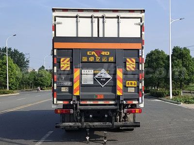 其它 | 车厢顶部封闭不可开启;EBS系统型号:EBS 5;生产企业:克诺尔制动系统(大连)有限公司;安装有限速装置,限速装置限速(km/h):80;安装有具有卫星定位功能的行驶记录仪;选装厢体开门型式及位置;选装瓦楞板结构厢体;选装后部结构;起重尾板为选装件(收起状态水平长度为290mm),尾板质量为550kg;选装不同厂家尾板以及尾板外观;该车选装ETC车载装置;发动机/油耗申报值(L/100km)对应关系为:F4.5NS6B220/26.28,YCS06245-60A/24.58,YCS04200-68/25.88;侧面防护及后下部防护装置材料材质:Q235,侧面防护连接方式:焊接连接;后下部防护装置连接方式:焊接加螺栓连接,断面尺寸(直径):Φ140(mm),离地高度:470mm;不带起重尾板时,后防护连接方式:焊接加螺栓连接;后下部防护装置断面尺寸(宽×高):60×120(mm),离地高度:470mm;运输独立容器(瓶)包装的介质类项号为:8;该车为危险品货物运输车;仅采用前轮盘式制动器,前置排气管,子午线轮胎;转向轮安装爆胎应急防护装置;后轴采用空气悬架. | ||