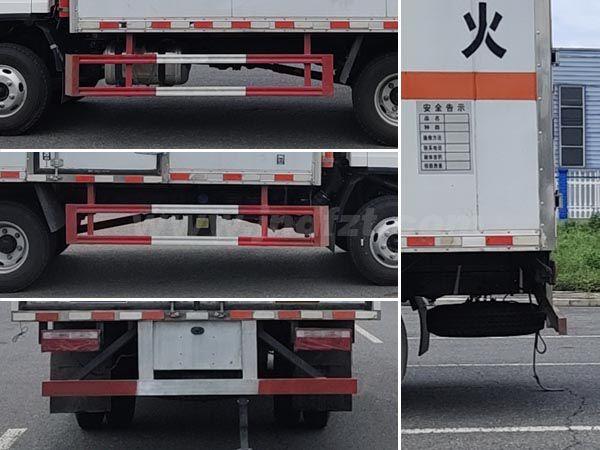 其它 | 车厢顶部封闭不可开启;ABS防抱死制动系统生产厂家/型号:1.广州瑞立科密汽车电子股份有限公司/CM4XL-4S/4M;2.浙江万安科技股份有限公司/VIE ABS-II;安装有限速装置,限速装置限速(km/h):80;安装有具有卫星定位功能的行驶记录仪;随底盘选装驾驶室;选装厢体开门型式及位置;选装瓦楞板结构厢体;选装起重尾板(收起状态水平长度为280mm),尾板质量为350kg;选装不同厂家尾板以及尾板外观;该车选装ETC车载装置;发动机/油耗申报值(L/100km)对应关系为:WP2.3NQ120E61/15.2,WP2.3NQ130E61/15.2,CA4DB1-12E6/13.38,CA4DB1-13E6/13.38;侧面防护及后下部防护装置材料材质:Q235,侧面防护连接方式:焊接连接;后下部防护装置连接方式:焊接加螺栓连接,断面尺寸(宽×高):45×100(mm),离地高度:495mm;选装起重尾板时,后防护连接方式:焊接加螺栓连接;断面尺寸(直径):Φ110(mm),离地高度:460mm;运输独立容器(瓶)包装的介质类项号为:2.1,2.2;该车为危险品货物运输车;仅采用前轮盘式制动器,前置排气管,子午线轮胎;转向轮安装爆胎应急防护装置; | ||