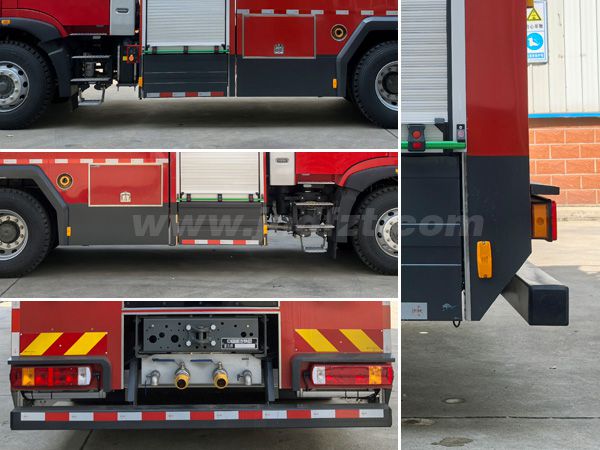 其它 | 罐体总容积为8.300立方米,异形罐体。水罐容积:6.100立方米,水罐尺寸:1680×2428×1598mm,泡沫液罐容积:2.200立方米,泡沫液罐尺寸:620×2428×1598mm。整体式侧防护结构,后防护装置材料:Q235,截面尺寸:120×120mm,与车辆连接方式:螺栓连接,后防护离地高度:395mm。后伸:90mm。ABS系统控制器生产企业/型号为威伯科(上海)管理有限公司/4460046300;选装EBS,EBS系统控制器生产企业/型号为威伯科(上海)管理有限公司/EBS3。主要专用装置有消防泵、消防炮。 | ||